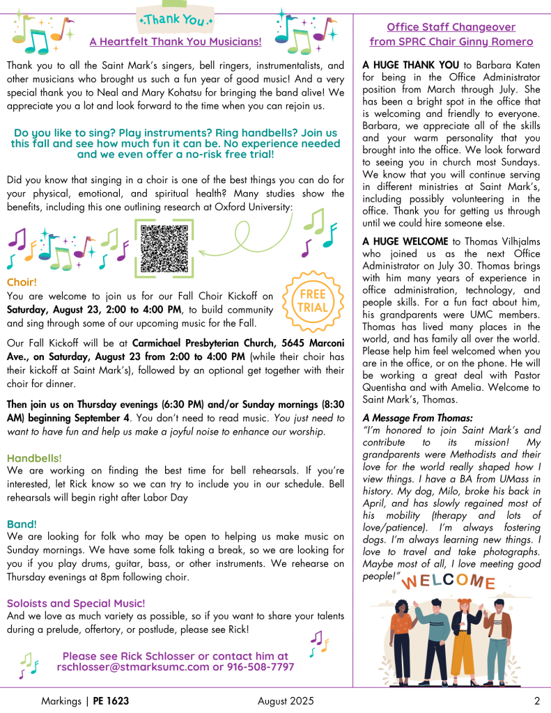 We want to share an important update with our Saint Mark’s community: Thomas Vilhjalms is no longer serving as our Office Administrator. Thomas’s time at Saint Mark’s was brief but impactful, and we wish him all the best as he begins a new employment journey!