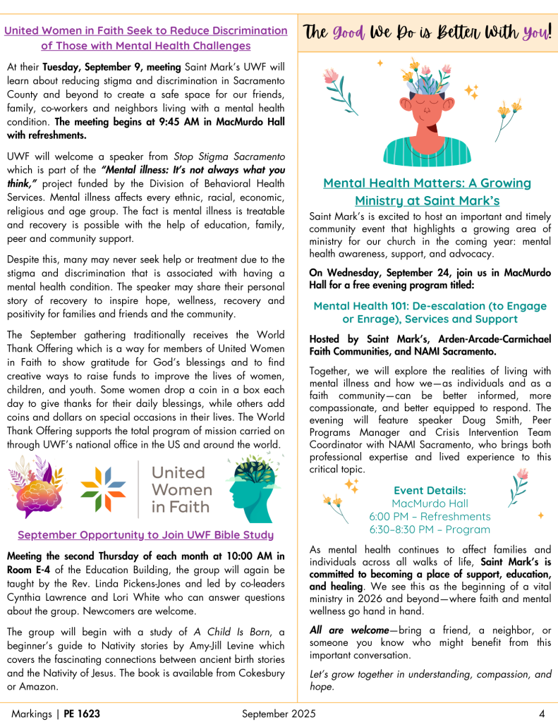 At the November 12 gathering of Saint Mark’s United Women in Faith thanks will be given for the current year and for the future. Join the group at 9:45 AM in MacMurdo Hall below the Sanctuary to share in refreshments while members make cards to send to those members who are not able to attend meetings. Readings will proclaim the Thanksgiving Message, and nominations for 2025 officers will be announced.