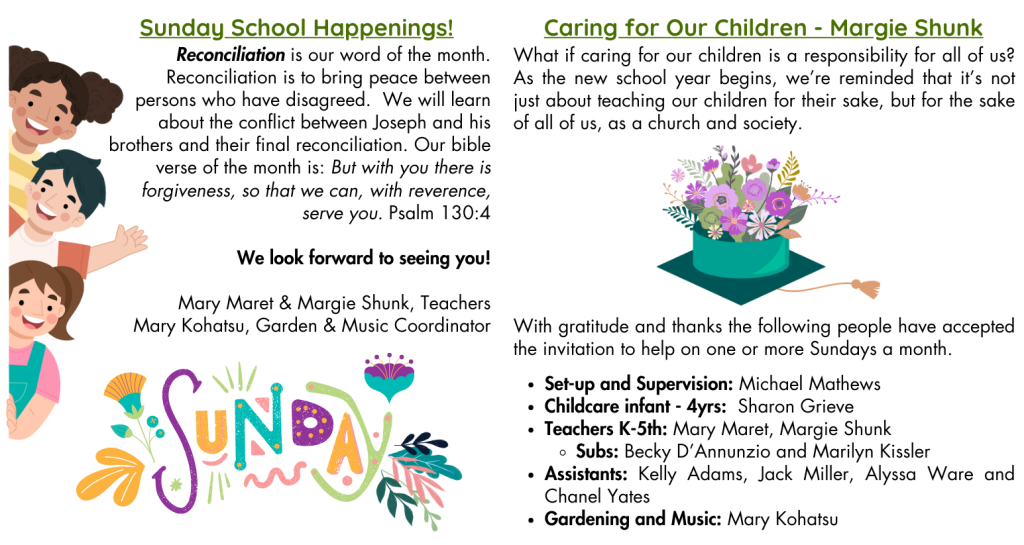 Boni Fields, Sunday School Director | Mary Muret & Margie Shunk, Teachers | Mary Kohatsu, Garden & Children’s Music Coordinator